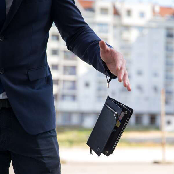 Een luxe portemonnee die is uitgerust met een speciaal vak voor je smartphone. De portemonnee heeft vakken voor papieren geld, munten, creditcards, een foto, SIM-kaarten en een riem voor comfortabel dragen om je arm. Dankzij de hoge functionaliteit is het een perfecte metgezel voor dagelijkse verplichtingen en situaties. De netjes georganiseerde vakken maken het eenvoudig om de benodigde waardevolle spullen snel te vinden. Het kwaliteitsmateriaal staat garant voor hoge duurzaamheid.